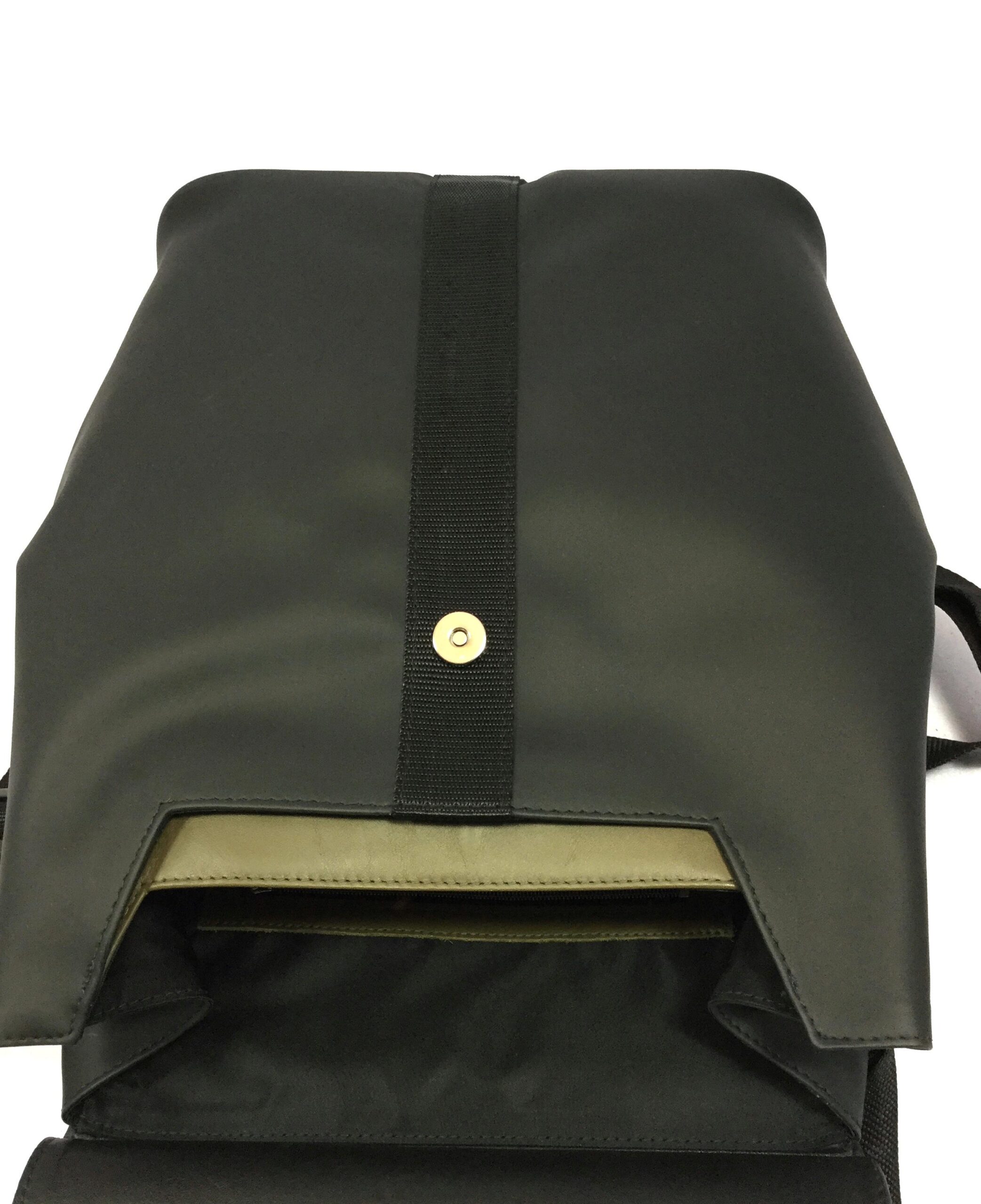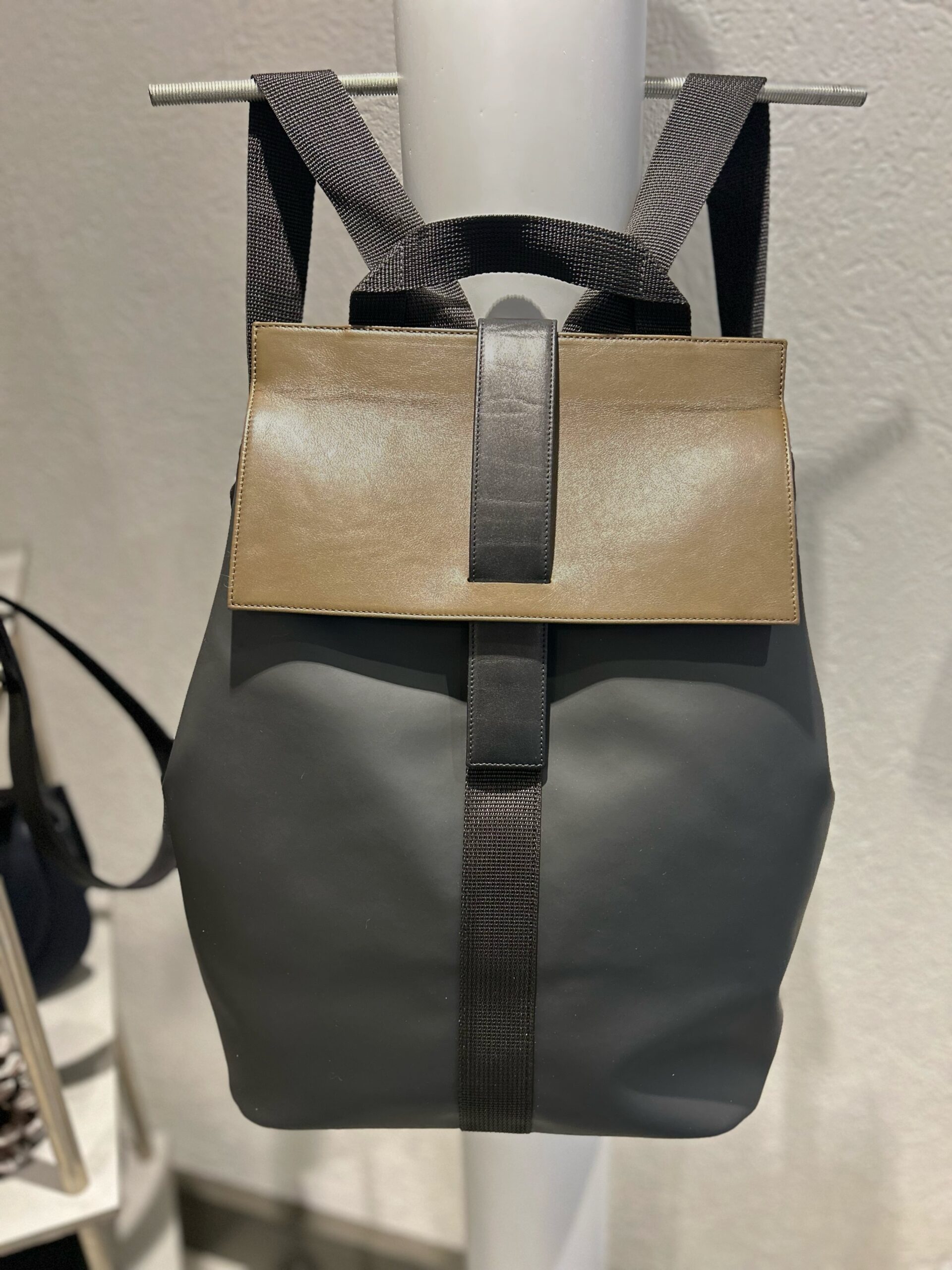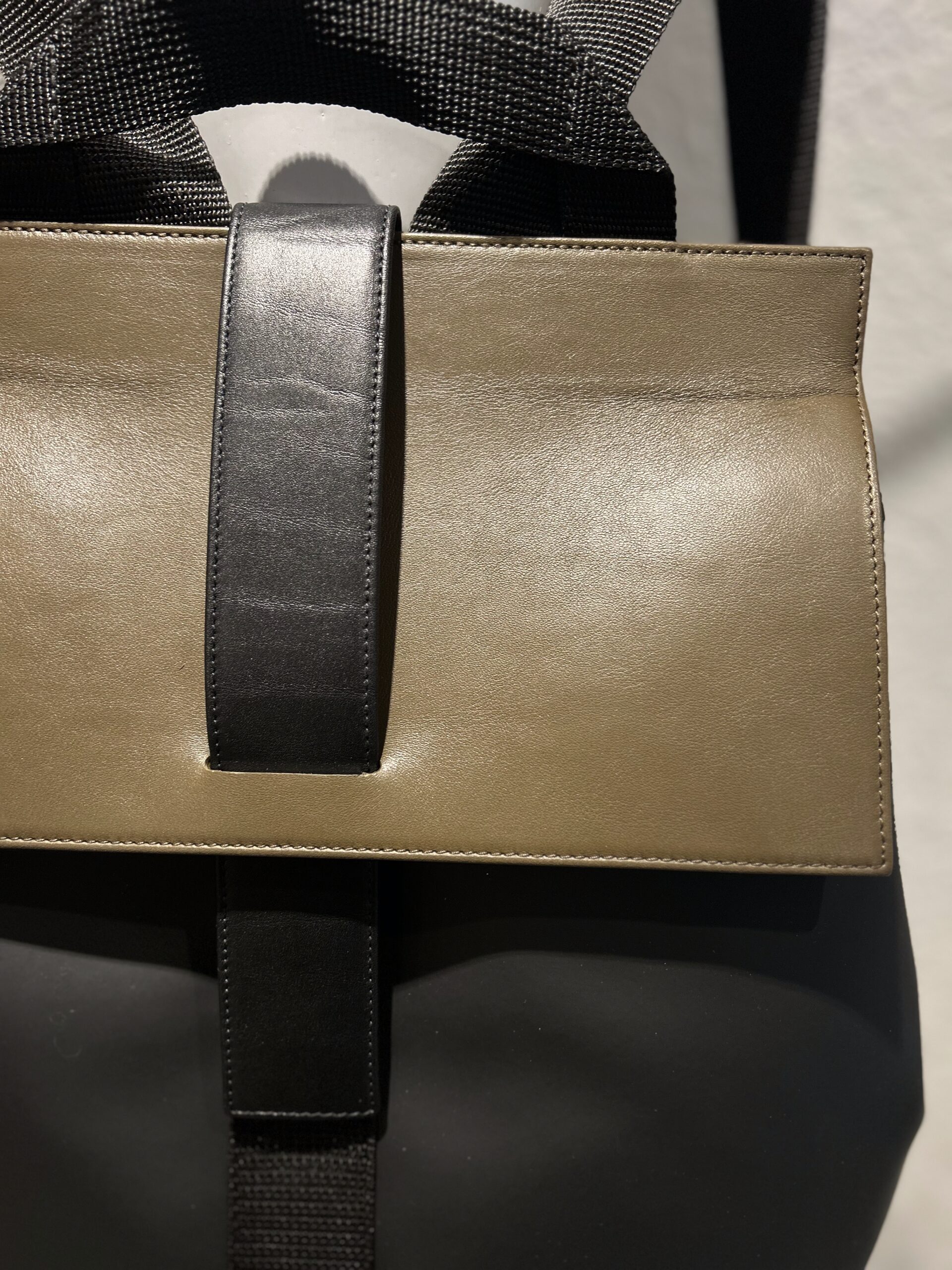 • black neoprene, smooth black and khaki leather